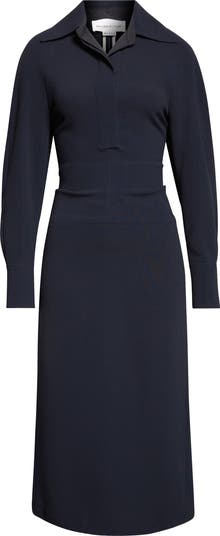 The eponymous label is renowned for its chic, understated aesthetic, illustrated through this polo-collar midi dress cut from fluid crepe and structured with back ruching that creates soft volume.
