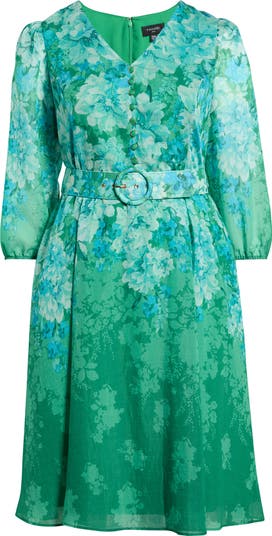 This V-neck long-sleeve midi dress features a belted waist and a full skirt, creating an elegant silhouette with graceful movement.