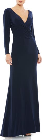 Simple and sleek, this chic jersey gown hugs your curves with a deep surplice neckline, long sleeves, and waist pleating. Perfect for winter weddings or holiday galas!