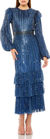 Shine in the Long Sleeve Ruffle Detail Sequin Dress, featuring dazzling sequins and elegant ruffle details, perfect for making a statement at any special event.