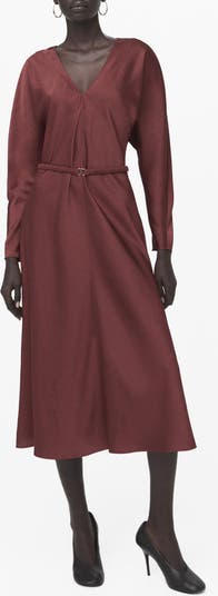 MANGO Long Sleeve Satin Midi Dress, Alternate, color, Maroon