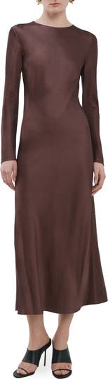 Minimalist drama best defines this slinky and figure-skimming satin midi dress framed by long sleeves and detailed with a slit at the back hem for ease of movement.