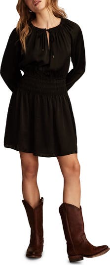 Play up your free-spirited side in a matte satin minidress that's shaped by a smocked waist and topped with a blousony bodice.