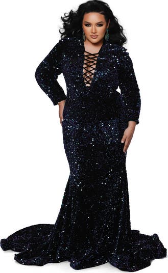 Our Clutch plus size sequin Mermaid gown guarantees you'll dazzle everyone at a Pageant or any black-tie event. Your head-to-toe glamours starts with the eye-catching stretch velvet that sparkles over all the fitted Mermaid silhouette. The bodice steals the show with the deep V-neckline boasting a unique lace- up down the plunging V-neckline. A high back coupled with long sleeves, both sewn in matching sequins, give you that arm coverage you've been craving and a look that hints at old Hollywood glamour. Body-con slim skirt features a sweeping train fit for a flawless red-carpet appearance.