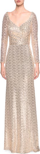 Glamorous fully sequined long gown with long sleeves and a soft V shaped neckline. A thin attached belt accents the waistline. Back zipper closure.