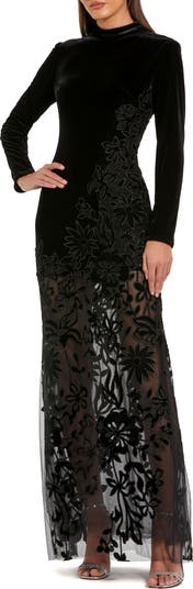 Sophisticated velvet gown with sheer floral embroidery, long sleeves, and a mock neck—perfect for evening elegance and formal events.