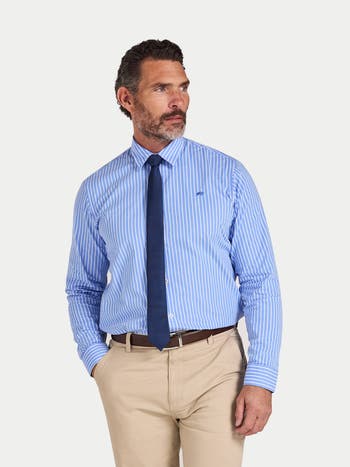 This Classic Long Sleeve Stripe Shirt is made from 100% cotton and is perfect for office wear. The stylish vertical white and light blue stripes make it a timeless wardrobe staple. It features a signature Raging Bull logo embroidered on the left chest in navy blue and button cuffs. Quality construction ensures long-lasting style.