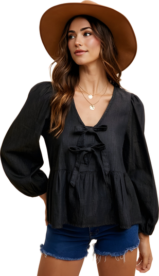 - Navy peplum blouse with long sleeves, tie-front bow accents, and a flowy silhouette.