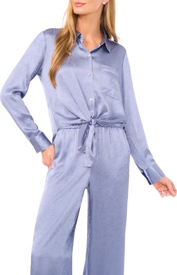 Lustrous crinkle satin and a tie-front detail at the waist soften the silhouette of a classic button-up shirt.