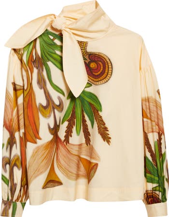 A nature-inspired motif in a painterly palette defines this tie-neck blouse, cut from satiny cotton poplin. The attached neck ties can be tied or draped for different moods, and the balloon sleeves enhance the soft silhouette.