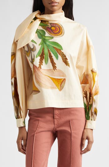 A nature-inspired motif in a painterly palette defines this tie-neck blouse, cut from satiny cotton poplin. The attached neck ties can be tied or draped for different moods, and the balloon sleeves enhance the soft silhouette.