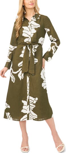 An abstract floral print charms on this airy linen-kissed shirtdress fashioned in a graceful A-line silhouette that's punctuated by a knotted waist tie.