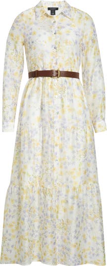 Sunny blooms sweeten this lightweight maxi shirtdress finished with a flouncy tiered skirt for graceful movement.