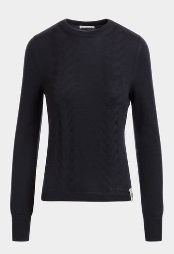 This long-sleeve top in navy blue cashmere and silk is enriched by vertical ajour knitting. A Bally Crest label finishes the lower hem.