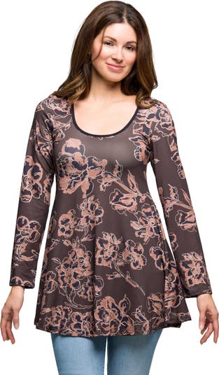 Bring effortless elegance to your everyday style with this brown floral print tunic top. Designed with a flattering scoop neckline and relaxed A line silhouette, this piece flows beautifully over jeans, leggings, or slim trousers. The long sleeves and longer hemline make it a versatile choice for both casual wear and dressier occasions. Crafted from a soft and comfortable polyester blend, this tunic offers both style and all day ease.
