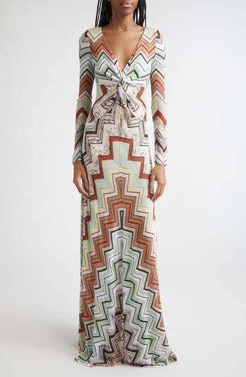 The Italian knit house's iconic zigzag jacquard is turned and seamed to achieve a graphic pyramid effect on this long twist-front dress cut in a slim profile.