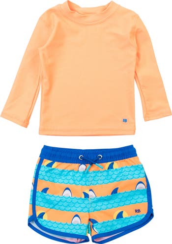Watch baby make waves in this cute little two-piece with a solid long-sleeve rashguard top and coordinating trunks with a soft liner.