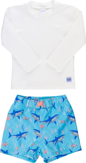 Watch baby make waves in this solid rashguard and shark-print trunks set complete with built-in sun protection.