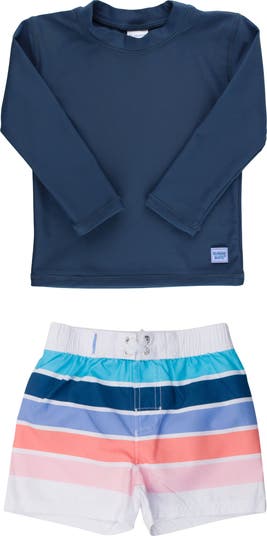 Baby can splash and play longer under the rays in this sun-protective duo pairing a stretchy long-sleeve rashguard with colorfully striped swim trunks.