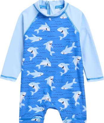 Let baby splash and play in this one-piece swimsuit that's outfitted with built-in sun protection and long sleeves that block out the sand and surf.
