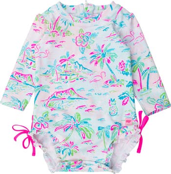 A wonderful addition to your little girl's swimwear, this One Piece Rash Guard is comfort and style rolled into one. Snaps at bottom make for easy changing. Made with sun protected fabric for all day protection and comfort.