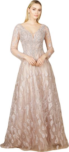 Long sleeve textured lace gown with sparkling stones and embroidery throughout. This gorgeous ballgown offers a modest design and is sure to be the center of attention at your next event