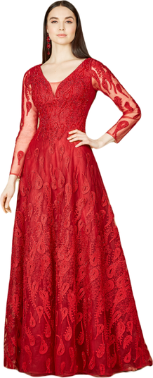 Long sleeve textured lace gown with sparkling stones and embroidery throughout. This gorgeous ballgown offers a modest design and is sure to be the center of attention at your next event