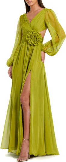 Long Sleeve V Neck Chiffon Gown With 3D Flower