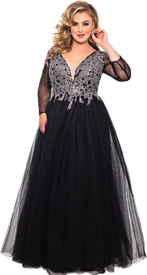 Create an air of mystery in our stunning silver and black embroidered bodice plus size dress. The plunging V-neckline, with silver embroidery detail is a show stopper. Illusion lace sleeves provide coverage with a hint of romance. Layers of tulle form a fairy-tale classic skirt. Pair with silver shoes and a crown to make your outfit complete.
