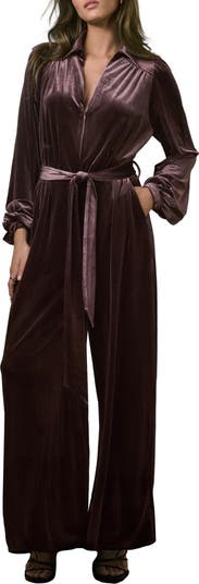 Stretch velvet drapes with unexpected lightness on this long-sleeve jumpsuit defined by gathering at the yoke and shoulders that creates a soft, elevated silhouette. A tie waist and wide flowy legs balance the subtle balloon sleeves, delivering a look that's comfortable enough to live in and dressy enough to command a room.