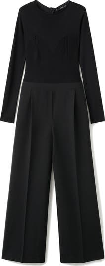 A finely ribbed top shapes the silhouette of this sleek jumpsuit contrasted with pleat-trimmed wide-leg pants.