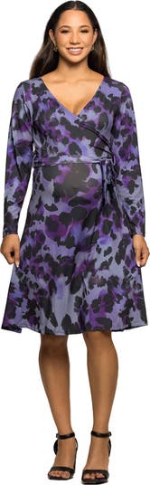 Brighten up your wardrobe with this purple black print maternity wrap dress that offers a stylish balance of color and elegance. The belted waist cinches for a flattering fit while the v neckline and long sleeves create a graceful finish. Perfect for both work and special occasions, this wrap dress delivers comfort and chic style in one piece.