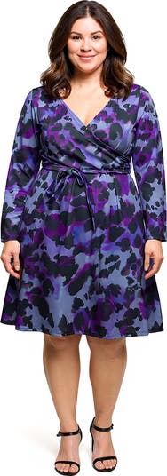 Brighten up your wardrobe with this purple black print plus size wrap dress that offers a stylish balance of color and elegance. The belted waist cinches for a flattering fit while the v neckline and long sleeves create a graceful finish. Perfect for both work and special occasions, this wrap dress delivers comfort and chic style in one piece.
