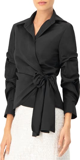 Long sleeve wrap shirt with ruched detailing and waist tie for a flattering fit.