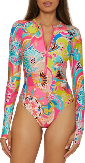 A front zipper makes it easy to slip into this sun-protected rashguard swimsuit made with thumbhole cuffs to keep your sleeves securely in place.