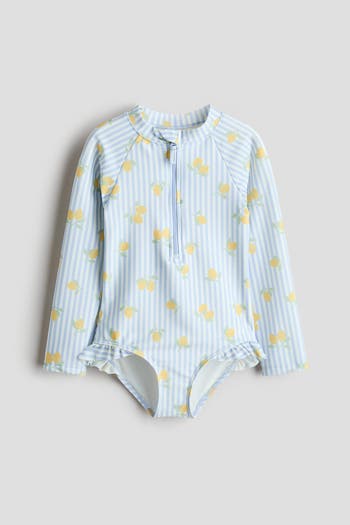 Printed swimsuit with a stand-up collar, zip at the top with an anti-chafe chin guard and long raglan sleeves. Lined front.