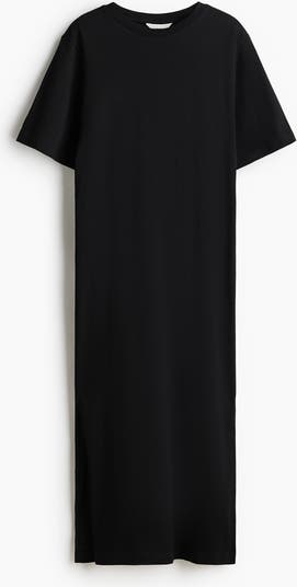 Long T-shirt dress in soft cotton jersey. Ribbed round neckline and a high slit at sides of hem.