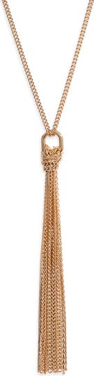 An engraved Saint Laurent Paris logo puts an understated house signature on this high-polish pendant necklace suspended with an artfully knotted chain tassel