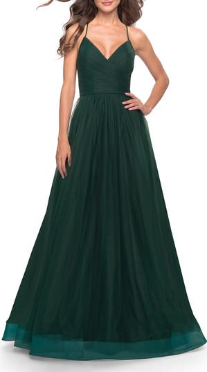 Timeless tulle prom dress with pleated faux wrap bodice and full skirt with pockets. Features a classic criss cross lace up back. Back zipper closure.