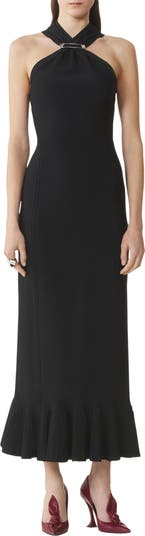 This dress is crafted from a fluid, compact viscose fabric that perfectly molds to the body's contours. The design details elevate the piece and feature a brooch at the neckline and ruffles at the hem.