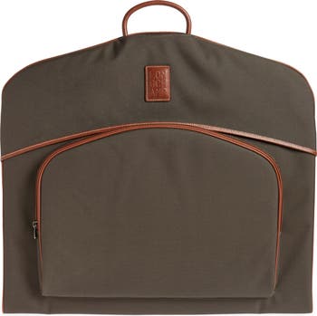 This sleek garment cover crafted from canvas with leather trim is perfect for storing workwear while you travel.