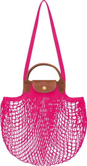Leather handles bring a sophisticated twist to this knit shopping bag that facilitates a waste-free lifestyle.