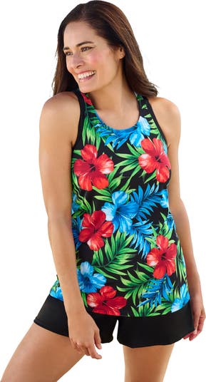 Embrace sporty-chic style—perfect for active days or lounging by the pool—with this high-neckline tankini top. Featuring a stylish contrast binding and a supportive racerback design, this top gives you exceptional bust support. Power-mesh shelf bra with soft wire-free molded cups.