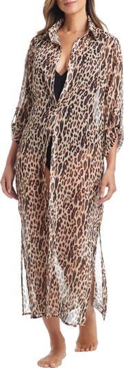 You'll look stylish as you make your way from hotel lobby to resort pool in this cover-up shirt fashioned in a longline silhouette and covered in animal spots for a unique finishing touch.