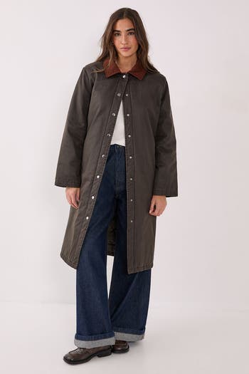 Make a statement in this distinctive longline coat featuring a wax effect finish that combines practicality with style. The contrasting cord collar adds a touch of countryside charm to this city essential. Perfect for unpredictable weather, this coat offers both protection and style in equal measure. Layer over wide-leg jeans and a simple white tee for an effortlessly cool weekend look, or pair with a jumper dress and chunky boots when temperatures drop.