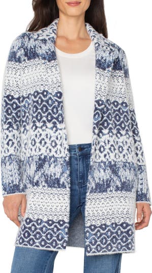 This fuzzy jacquard cardigan features an intriguing mix of patterns in a longline silhouette that's perfect for layering.