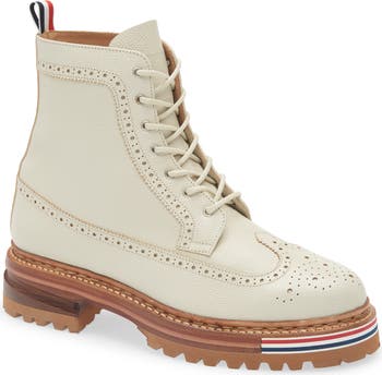 Wingtip brogueing distinguishes this lace-up boot crafted in Italy from pebbled leather and set on a rugged lug sole. A grosgrain-ribbon tab at the heel displays the brand's signature stripes, as well as the front toe inset of the layered sole.