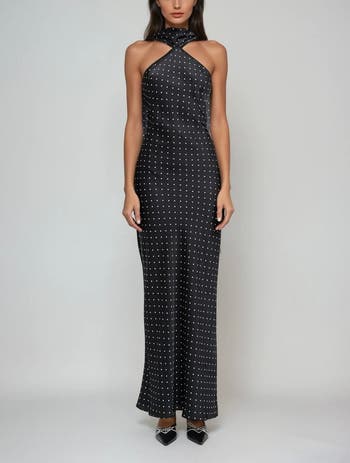 Elegant and timeless, this halter gown is cut from fluid satin patterned with petite polka dots. The high neckline and crisscross halter straps create a sleek, elongated silhouette, while the floor-length skirt drapes effortlessly for a graceful finish. Perfect for evening events, up-scale occasions, or elevated dinners.