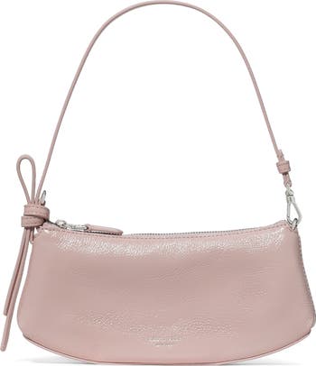 A structured design and knotted strap distinguish a patent leather shoulder bag featuring a '90s-inspired profile and convertible strap for versatile carry.