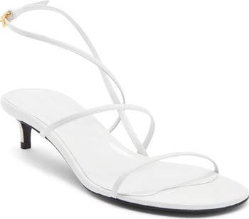 Ribbon-like bands of smooth Italian kidskin elegantly loop across the foot in this minimalist kitten-heel sandal with a hidden elasticized inset beneath the gilded buckle.